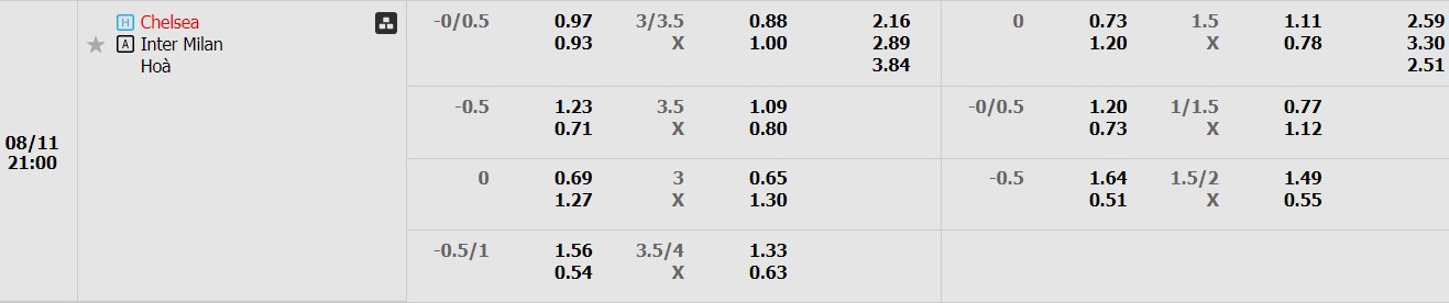 • Mức kèo nhà cái cược chấp trận này: Chelsea chấp 0,25 Trái. Chelsea ăn 0,97. Inter Milan ăn 0,93