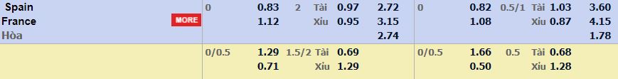 - Mức kèo nhà cái cược chấp trận này: Hòa – Được – Thua. Tây Ban Nha ăn 0,83. Pháp ăn 1,12