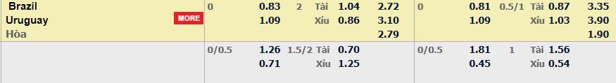- Mức kèo nhà cái cược chấp trận này: Hòa – Được – Thua. Brazil ăn 0,83. Uruguay ăn 1,09